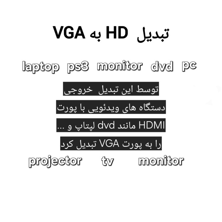 مناسب: توسط این تبدیل خروجی دستگاه های ویدئویی با پورت HDMI مانند dvd لپتاپ و ... را به دستگاه هایی که پورت VGA دارند مانند تلویزون یا مانیتور تبدیل کرد